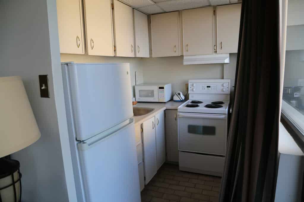 There’s an odd thing about the Business Inn & Suites. Despite the suites themselves being extremely spacious and well proportioned, I found most of the hotel’s public areas small and claustrophobic. The worst culprit has to be that underground parking garage – what a nightmare! With a full-size car I had only a few inches to spare on each side when entering the garage ramp. Once you do get below, the garage is extremely narrow and cramped with pillars and obstacles everywhere. My car hit bottom both coming and going out of the ramp every time. If you drive even the tiniest SUV you’ll definitely want to book a space in the outdoor parking lot beside the hotel. Secondly, the two elevators for the entire building are extremely small and coffin-like, and there was always a long, long wait for them anytime I needed to go anywhere. When the elevators finally did arrive they would always be heavily packed with guests and hotel staff going about their duties. And then there’s the breakfast room – it was far too crowded and cramped, with everyone scrambling around and crashing into each other while trying to toast their bread and bagels at the same time at the overcrowded breakfast table. This area needs to be configured differently so that the high-demand areas are not all concentrated into one tight spot on the tables. This should help better accommodate the masses of people who show up every morning for breakfast here.