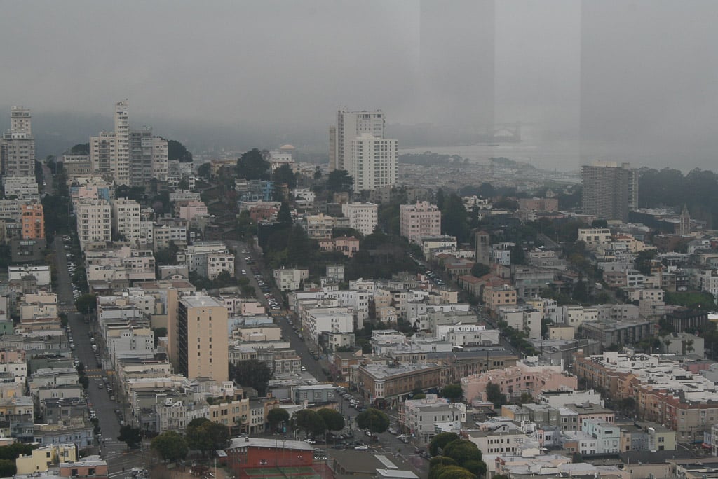 I toured the grounds then went up to the top of Coit Tower (via elevator of course) for an awesome, albeit misty/cloudy, 360-degree city view: