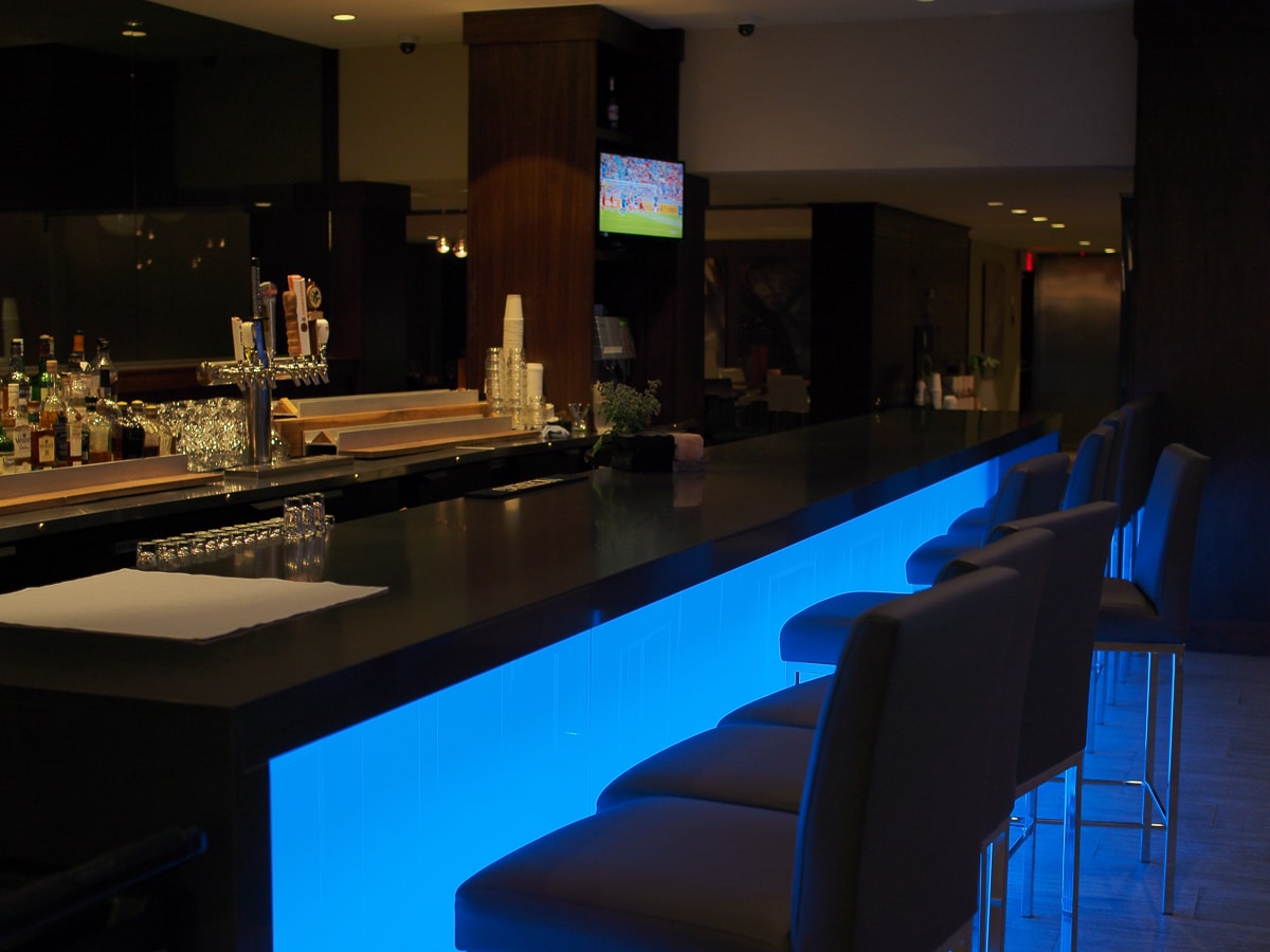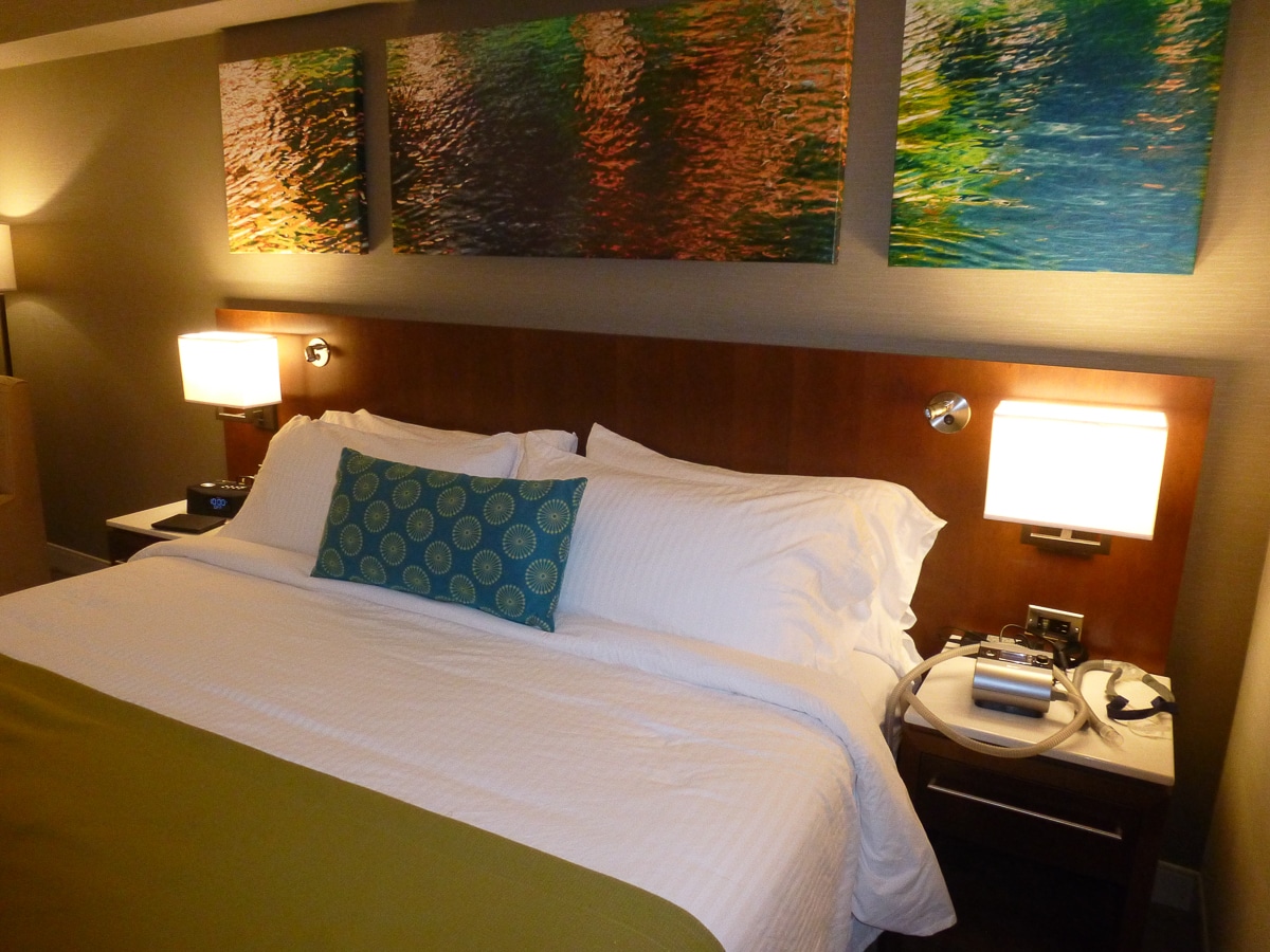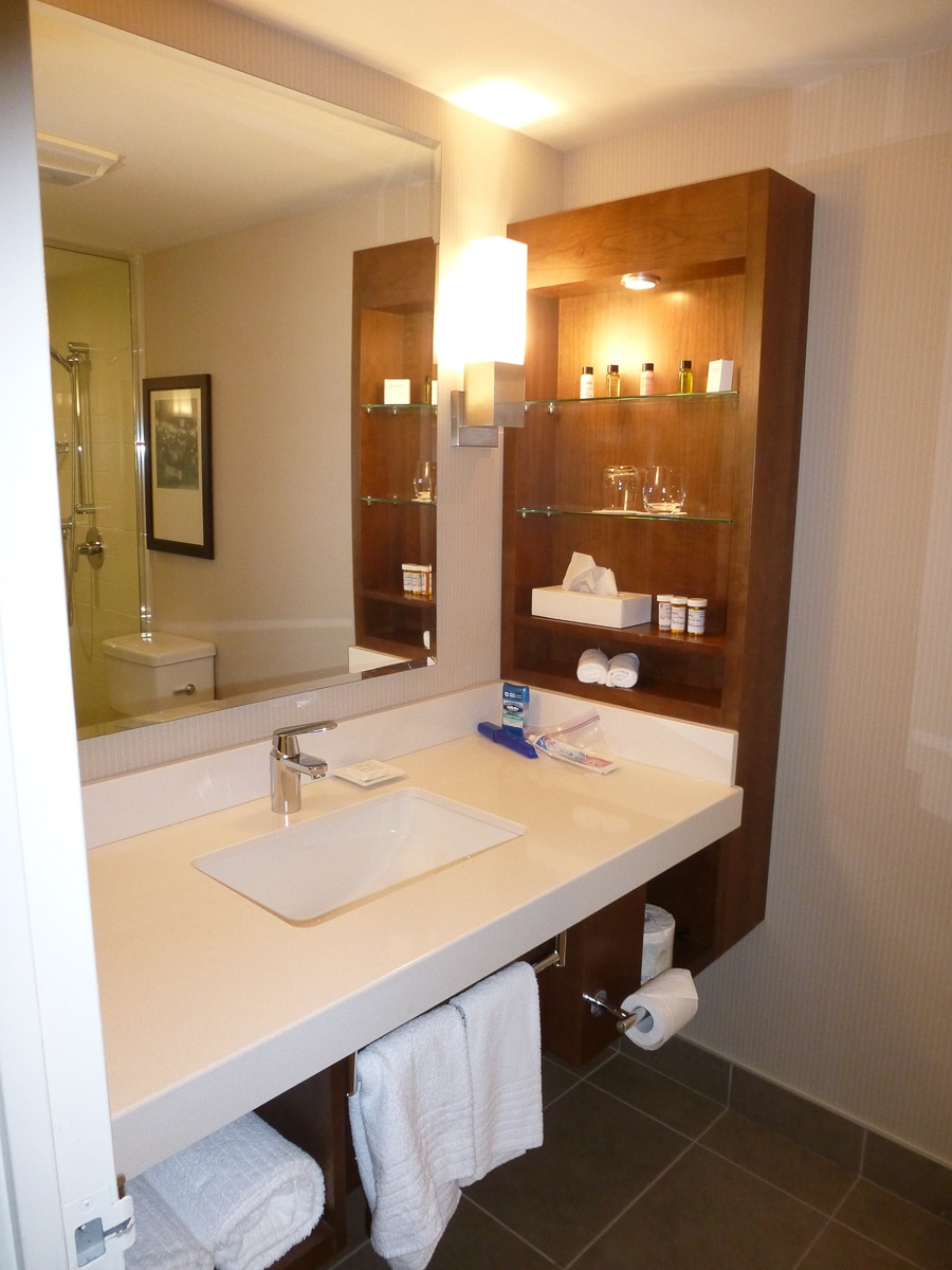 Our room was large with a very comfortable king-size bed. The bathroom, with a glass-walled walk-in shower, was gorgeous. A high-tech desk offered almost every kind of connection and plug you could need for portable multimedia devices and/or a notebook. A small bar-size refrigerator was also concealed within the desk unit. Toiletries, ironing board, iron and bathrobe were supplied. The room was extremely clean in every way; hotel housekeeping staff did a great job during our two-night stay. While the free WiFi was “just OK”, I noticed that it tended to be on the slow side and stalled occasionally.