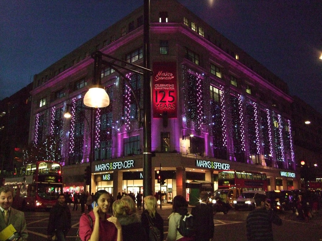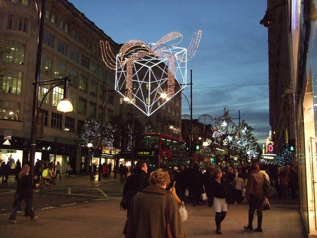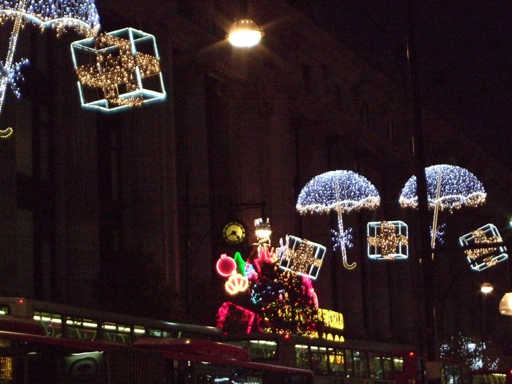 In London this time of year, night falls very early. At about 4:30 p.m. the Christmas lights along Oxford Street started to come alive: