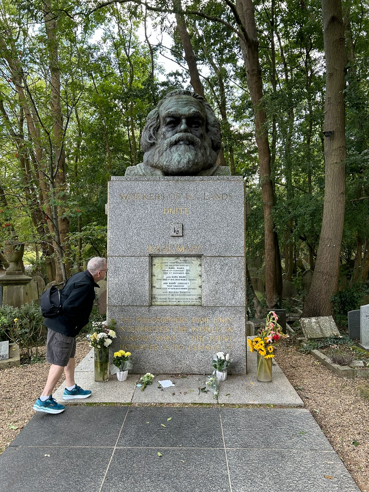 We reached the Cemetery and picked up our tickets. By then it was noon, so we had a couple of hours to kill before our tour of the West Cemetery at 2:00PM. We made our way into the East Cemetery and made the rounds, noting the tomb of Karl Marx, among others. Fascinating place: