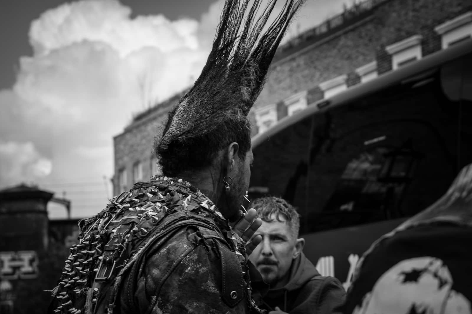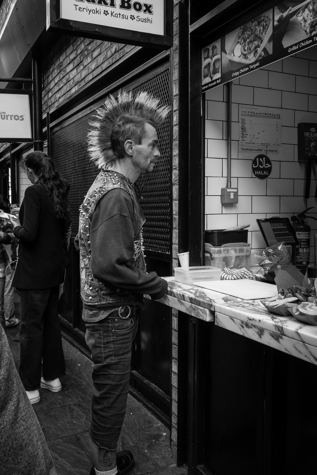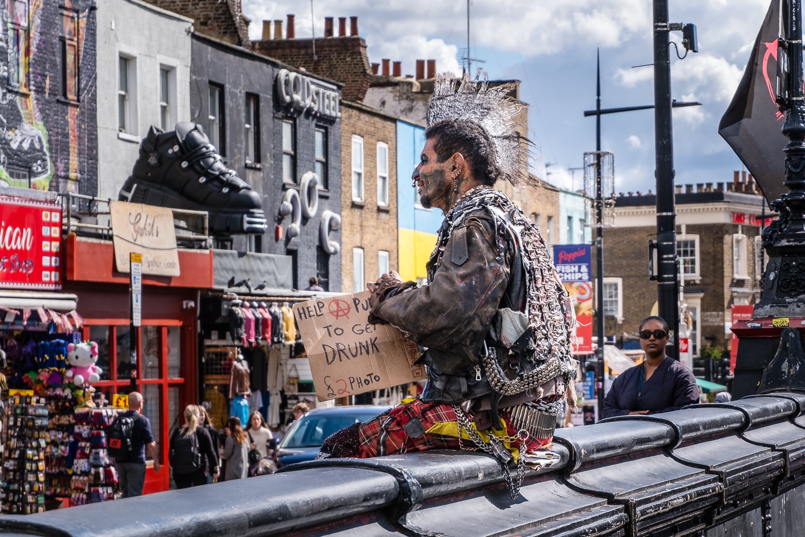 I highly doubt these guys were serious, authentic hard-core punks. They were no doubt down from the burbs, going “punk for a day”, to pick up some extra cash from the tourists around the market; they made no bones about taking a bit of cash at any rate (£2 a photo!):
