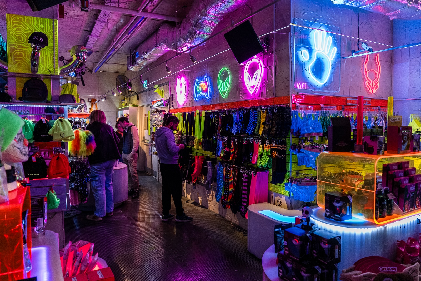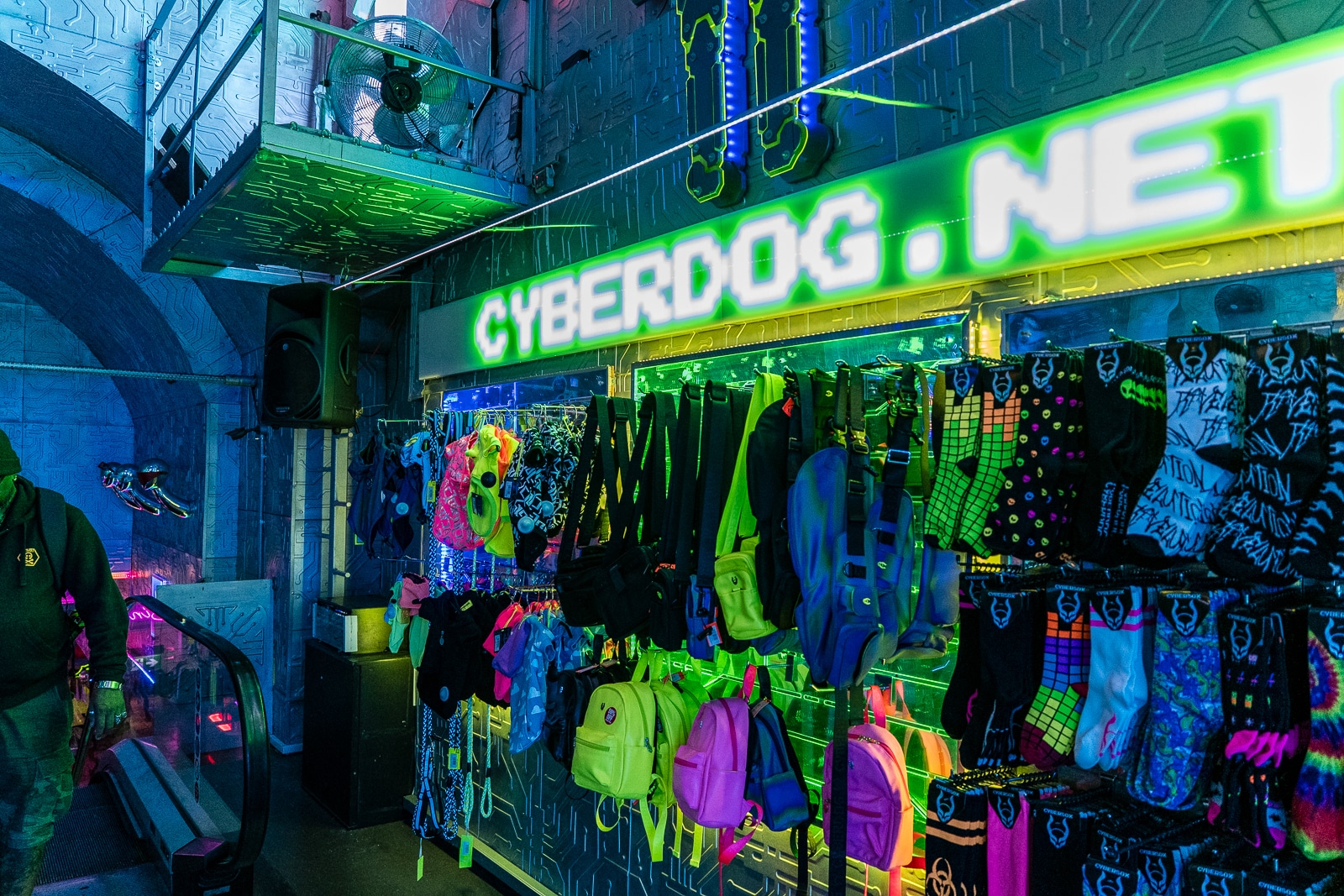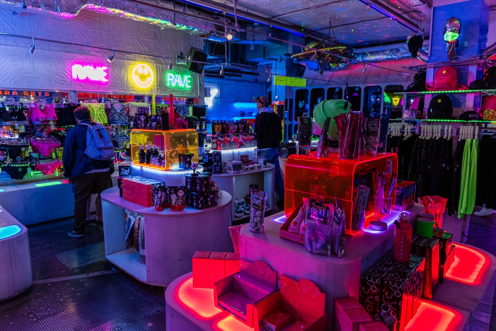 So what is Cyberdog? It’s a trance music and cyber clothing retail chain, first created in 1994. Headquartered in Camden Market, it specializes in bright dance clothing, often featuring fluorescent colours and electronic components such as flashing lights. They also specialize in rave accessories such as glowsticks and other fluorescent items. Their rave-wear, ravetoys, shoes, jewelry, are divided into four categories: Kawaii, Neon Clubwear, 2090s (or Futuristic), and Cybertronic.