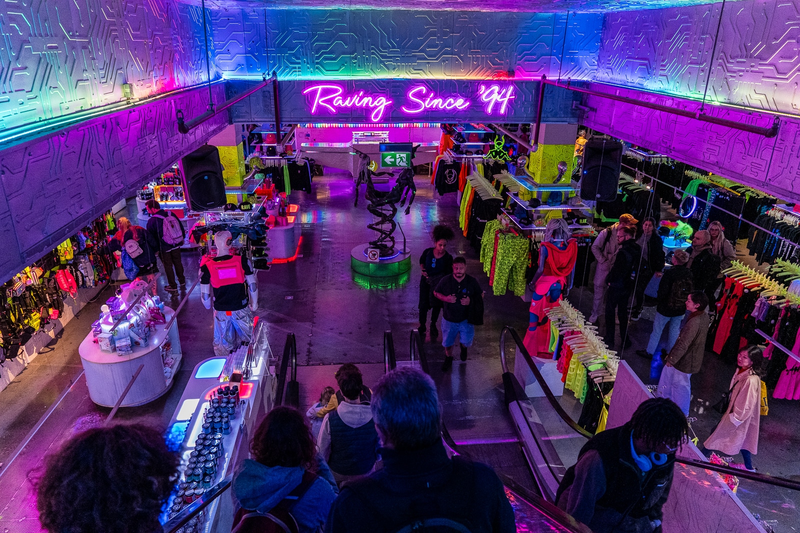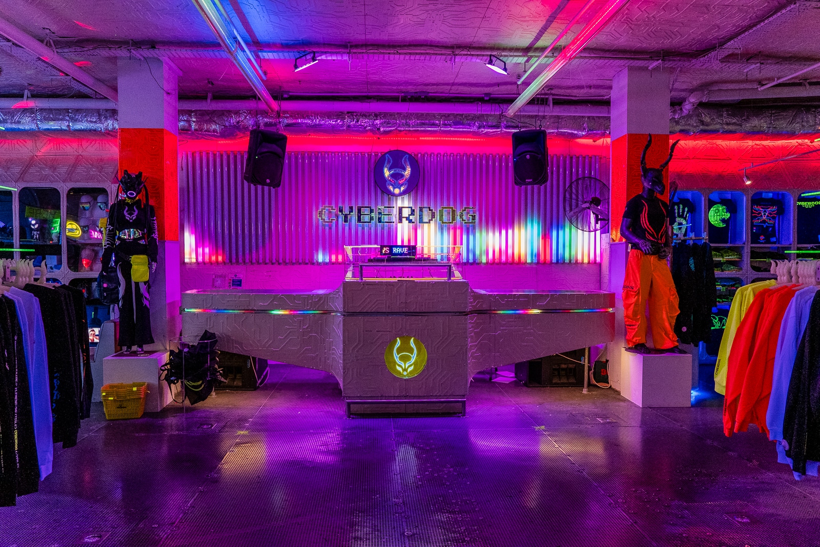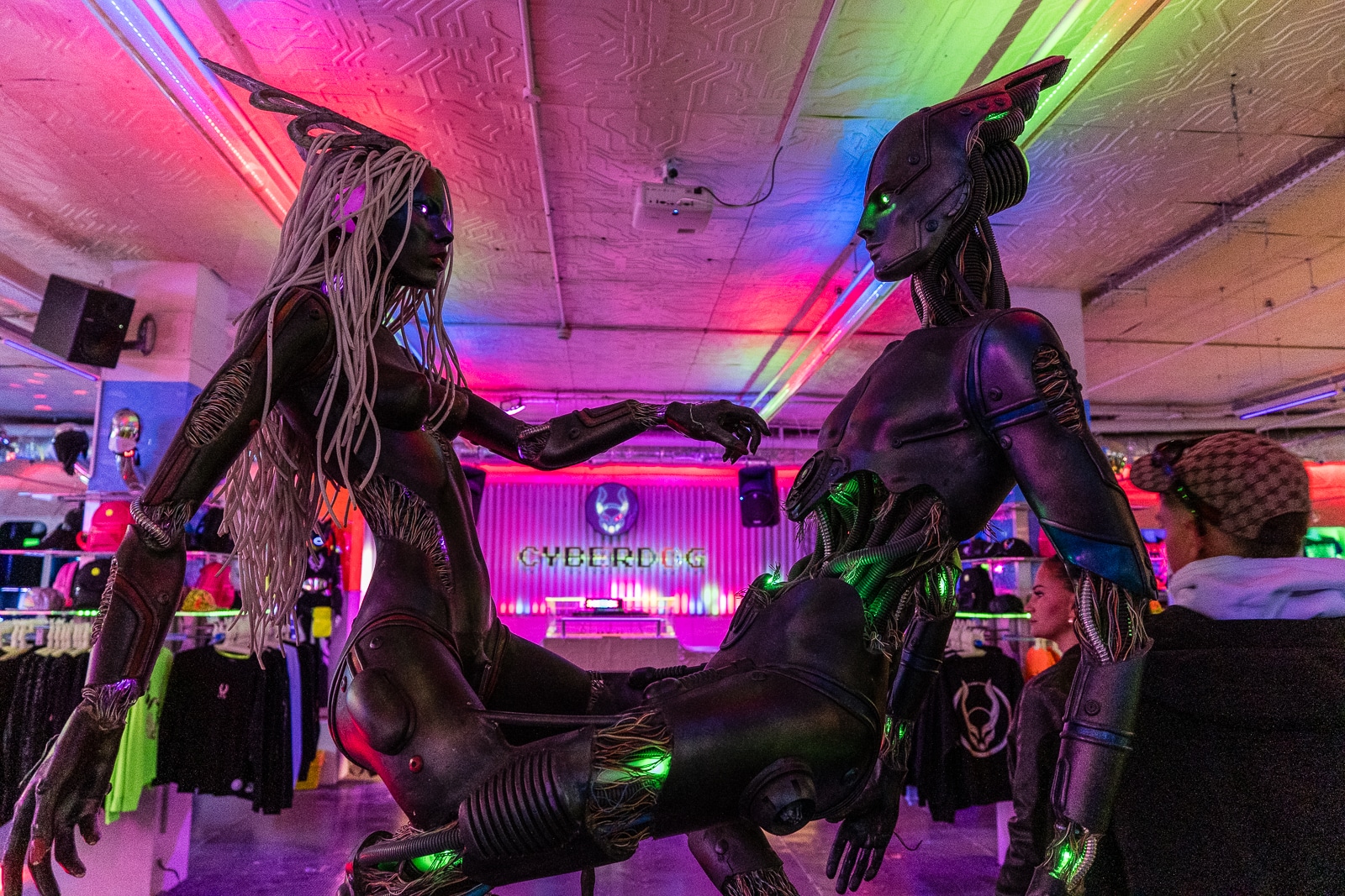 So what is Cyberdog? It’s a trance music and cyber clothing retail chain, first created in 1994. Headquartered in Camden Market, it specializes in bright dance clothing, often featuring fluorescent colours and electronic components such as flashing lights. They also specialize in rave accessories such as glowsticks and other fluorescent items. Their rave-wear, ravetoys, shoes, jewelry, are divided into four categories: Kawaii, Neon Clubwear, 2090s (or Futuristic), and Cybertronic.