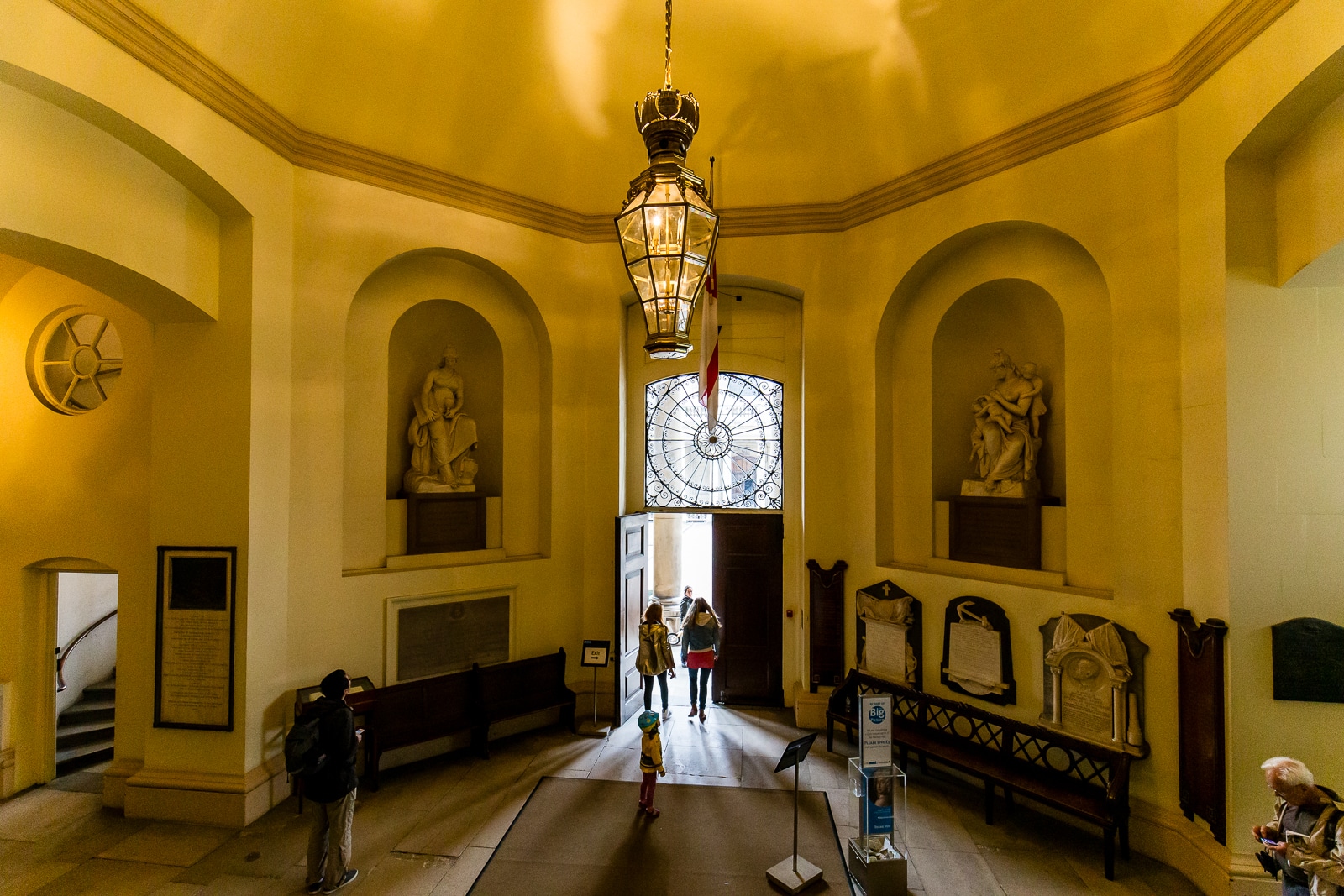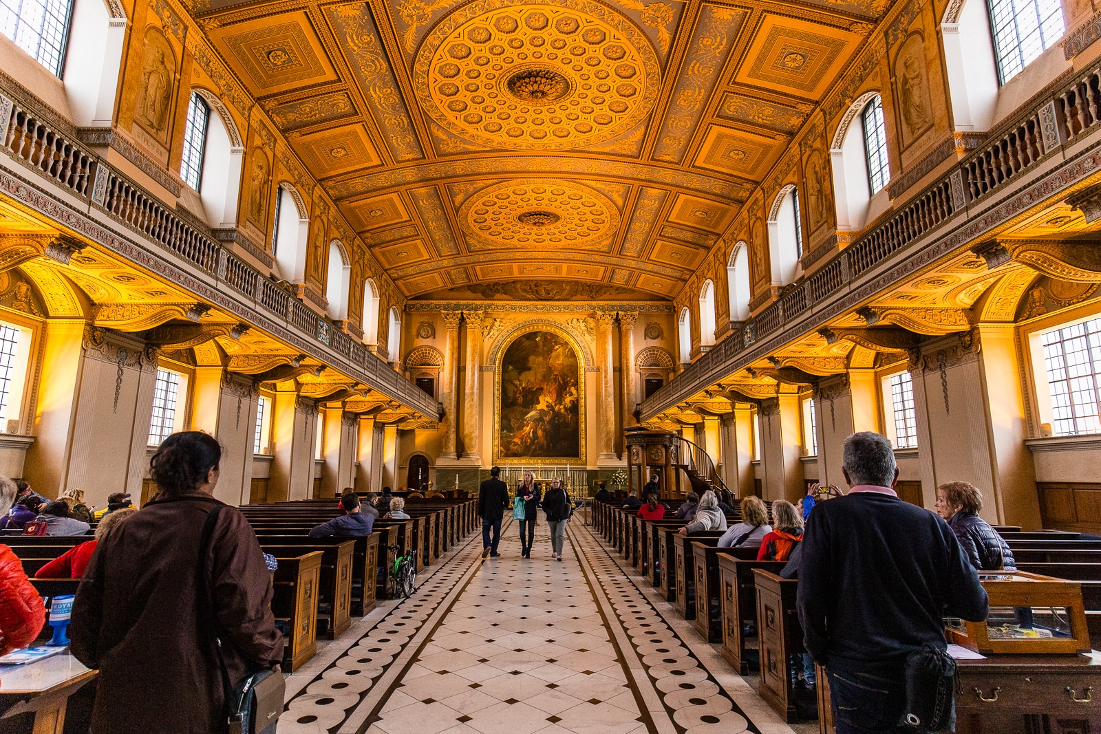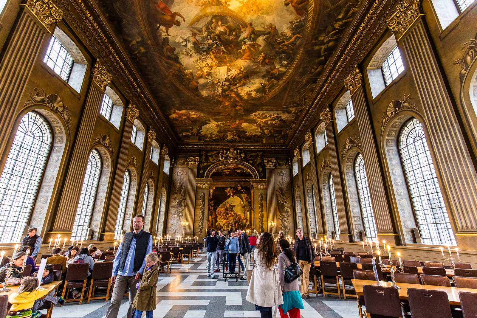 The Painted Hall was built as a grand ceremonial dining room. James Thornhill’s painted interior is considered to be the masterpiece of English Baroque art. The main ceiling features William III and Mary II, the founders of the Royal Hospital and celebrates Britain’s political stability, commercial prosperity and naval power.
