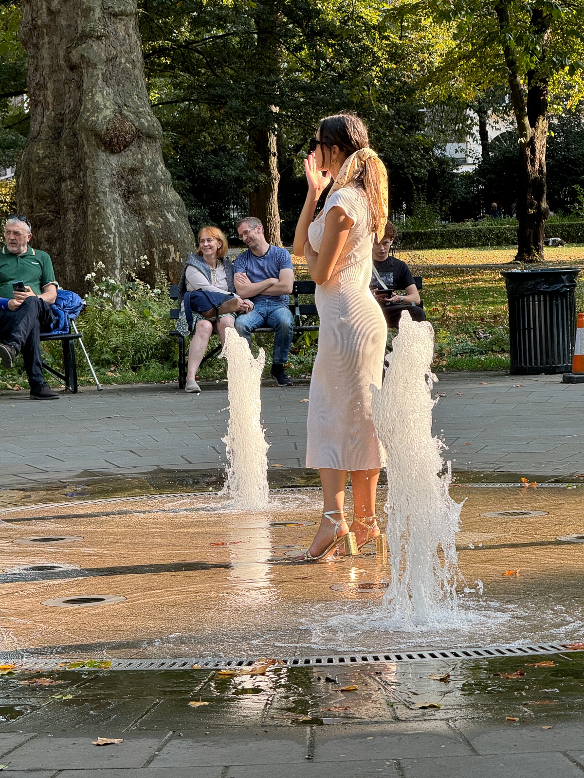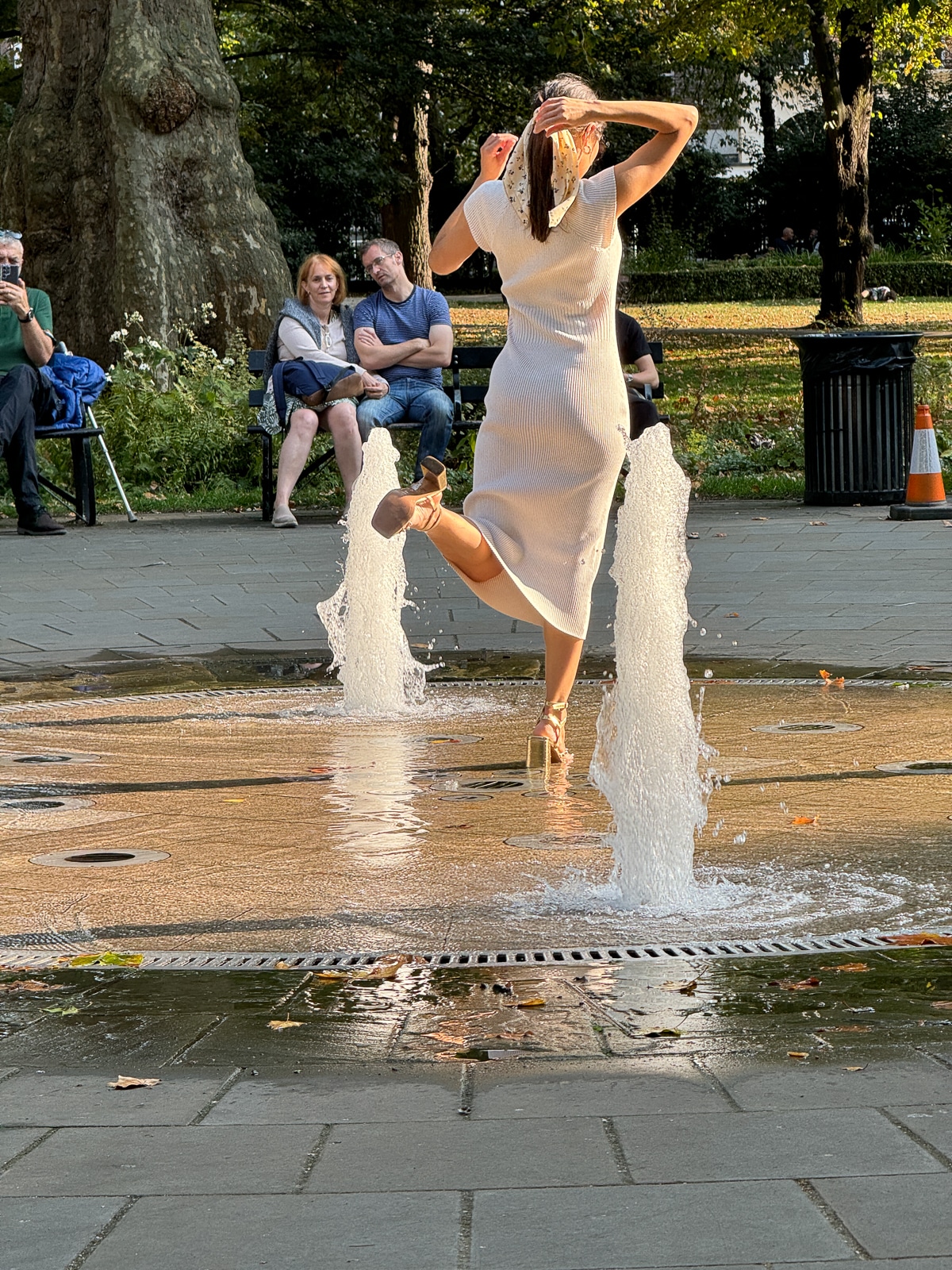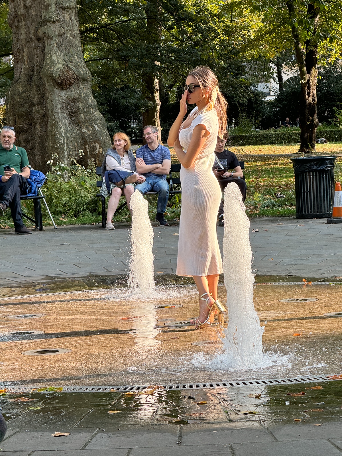 While we were sitting in Russell Square, we couldn’t help but notice an attractive young woman splashing around in the park’s centre fountain, a la Anita Ekberg in La Dolce Vita but much more subdued. I then noticed a professional photographer giving the model direction, so then I understood what was going on: