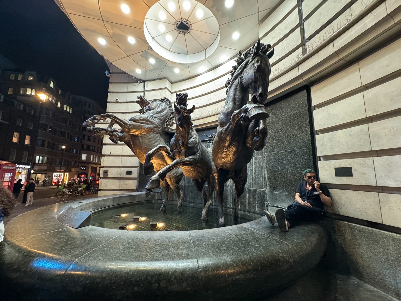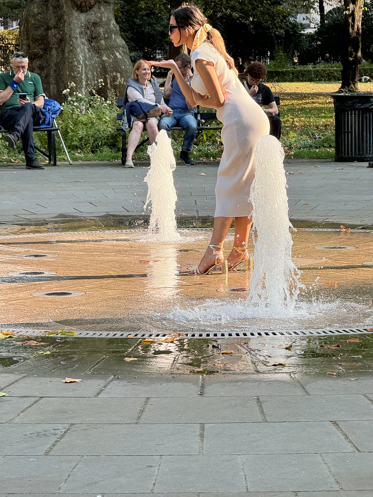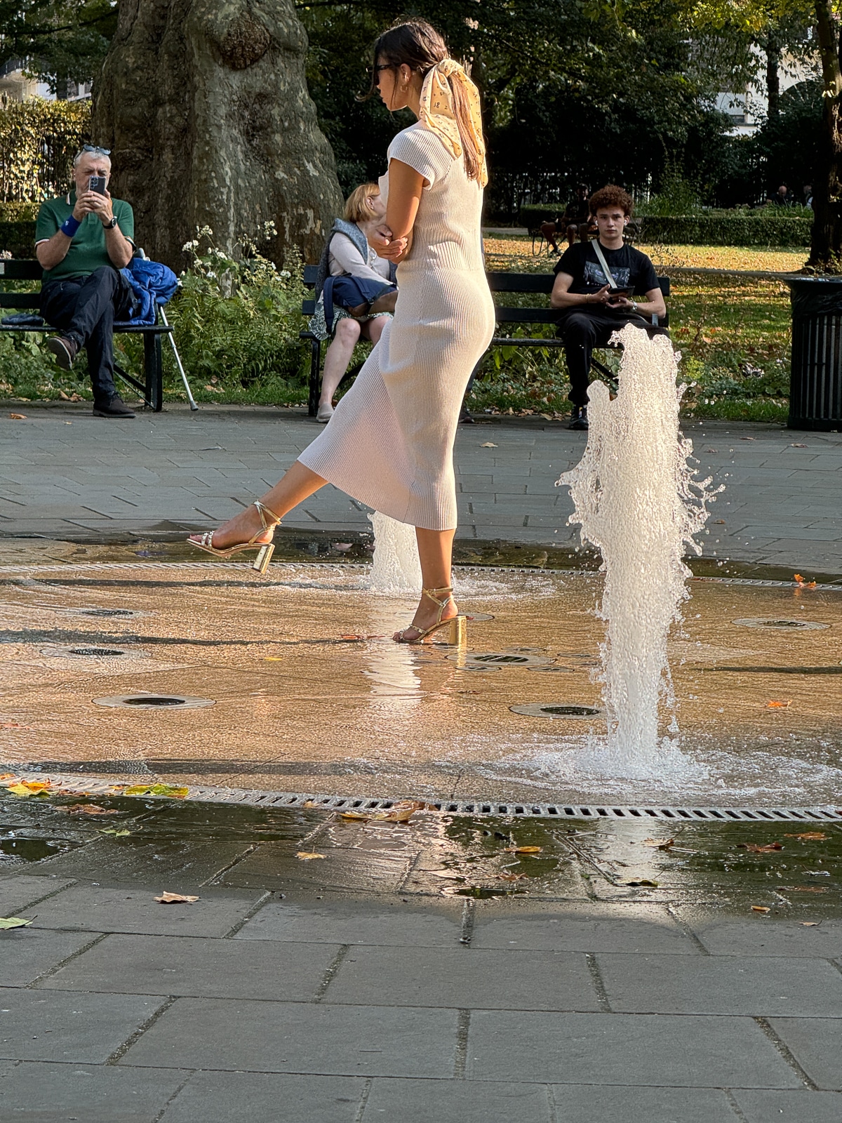While we were sitting in Russell Square, we couldn’t help but notice an attractive young woman splashing around in the park’s centre fountain, a la Anita Ekberg in La Dolce Vita but much more subdued. I then noticed a professional photographer giving the model direction, so then I understood what was going on: