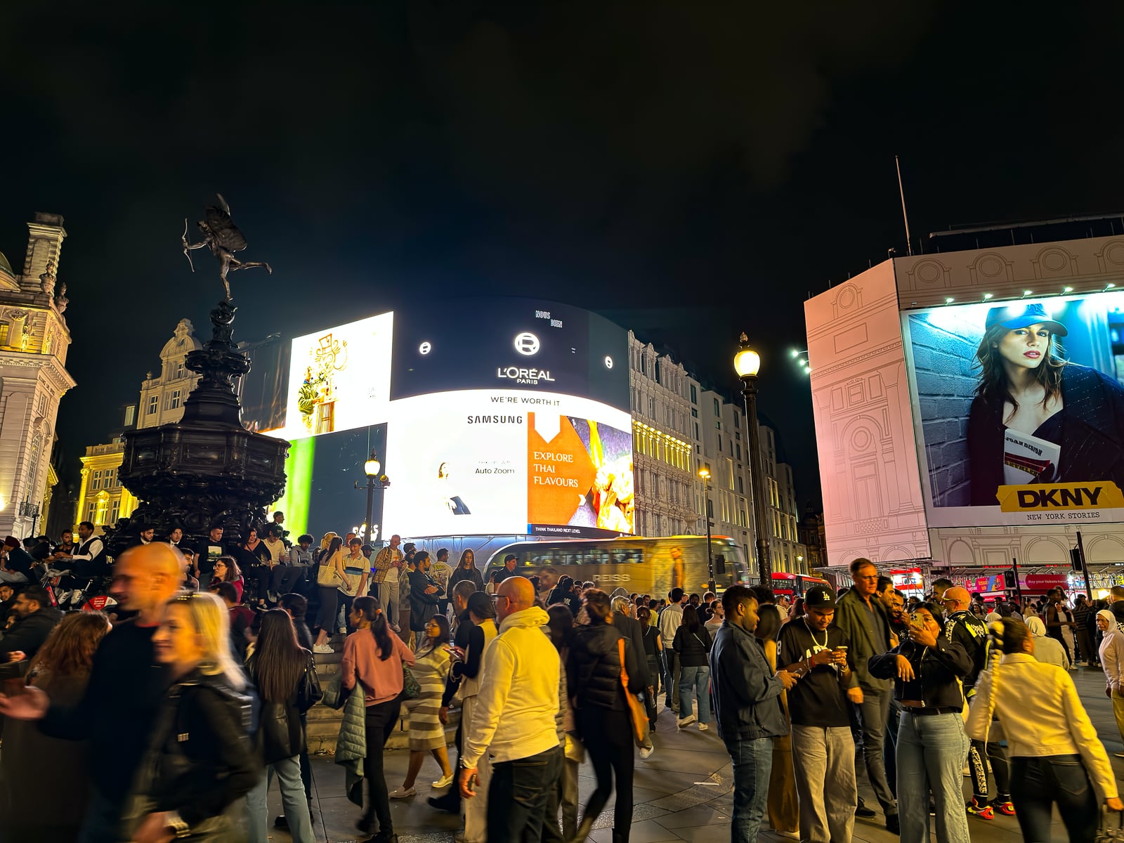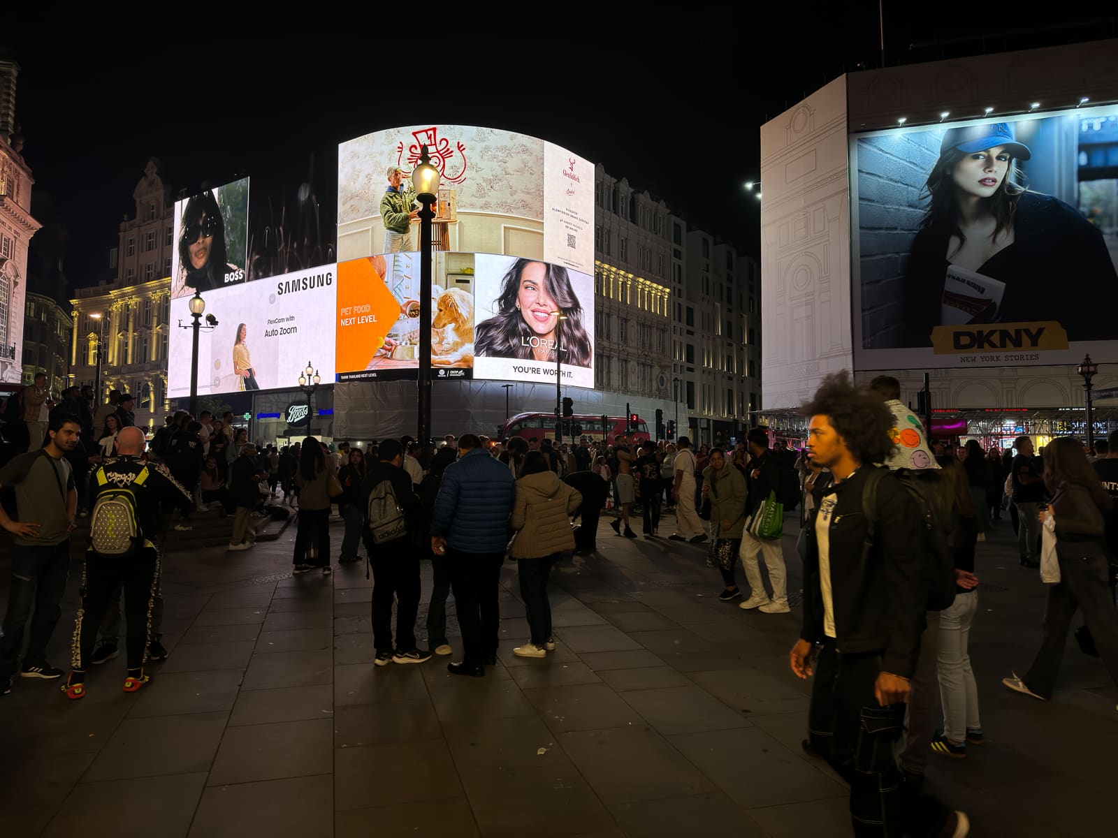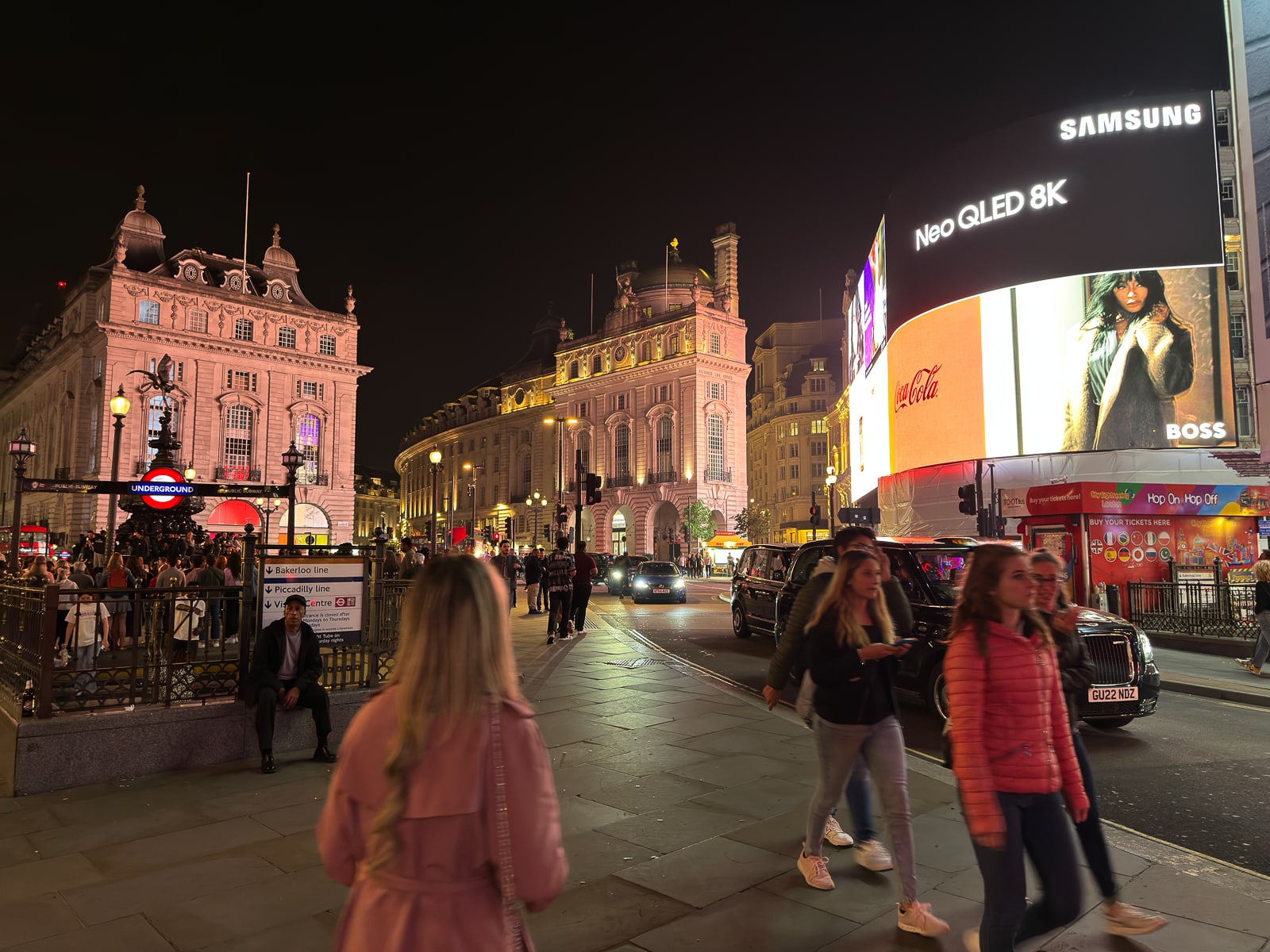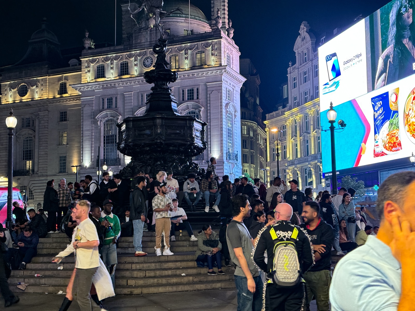 I shot a little movie of the goings-on in Piccadilly Circus that night. Nothing special happens in this video, it’s just Piccadilly Circus going about its business on a typical Saturday night in central London; people hang out for hours there, just milling about. When we were there, there was some kind of street dancing going on but there were so many people we couldn’t actually see the performance: