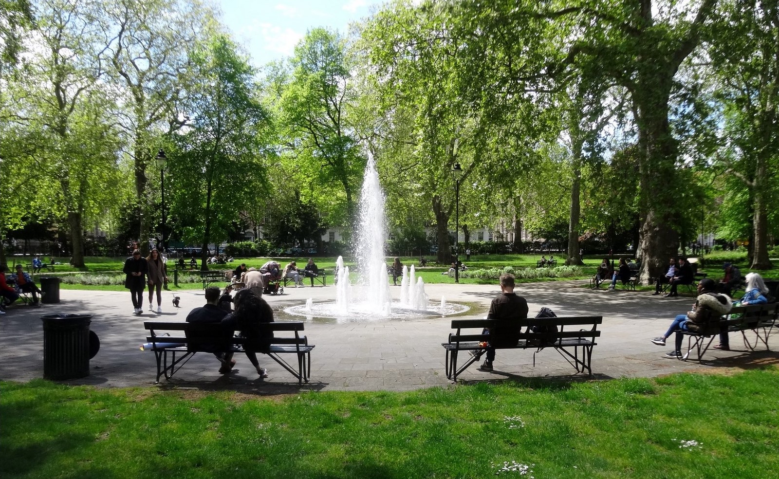 We did some very minor unpacking, leaving almost everything in the suitcases as we were checking out fairly early the next morning, then left the hotel to take a walk around Bloomsbury. We stopped in at Leon to have a drink and soak up the London vibe. We decided to continue our wanderings around Bloomsbury, so we went through the beautiful and relaxing Russell Square – where we paused for a long while, enjoying the relaxing and shady park: