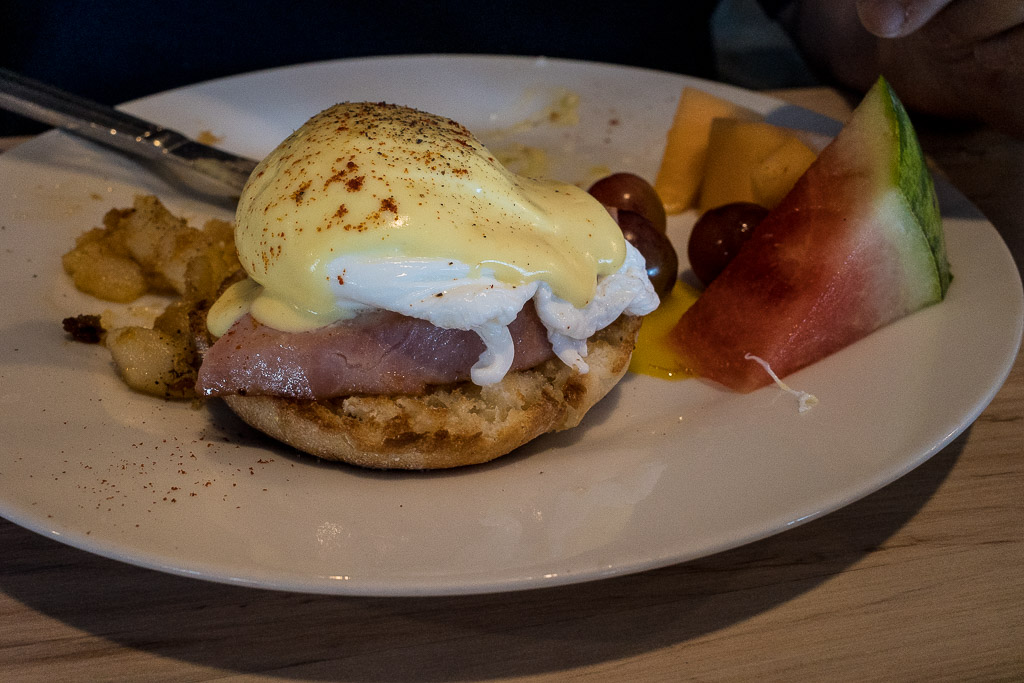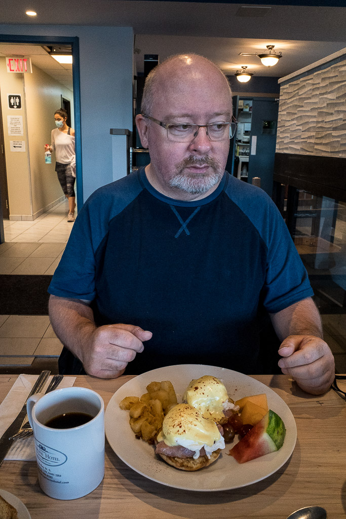 Reaching the hotel we found three people in queue ahead of us – the staff were only letting in a few people at a time due to COVID restrictions. After a 20 minute wait, though, we were ushered in and guided to a little table. I had the Breakfast Special (sausage, eggs, toast, etc.) and Vince had the Eggs Benny, which had been much heralded on TripAdvisor. Breakfast was absolutely delicious: