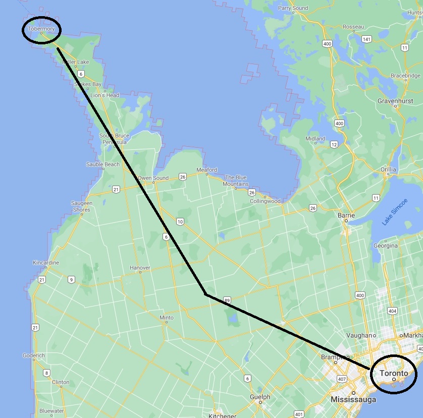 It was 11:00 when we hit the road. According to Google, Tobermory to Toronto takes a little over 4 hours on a good day. We stopped for $10.00 worth of gas in Wiarton as the tank was getting lower than I felt comfortable with. I had purchased a gas plan with Hertz, meaning that the vehicle’s fuel tank could be brought back near-empty and Hertz will fill it upon return (and charge me, of course). It was a tricky thing to keep the gas near empty for return, but not run out of fuel on the returning journey.