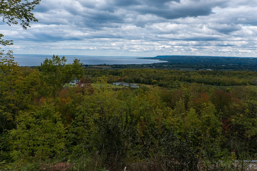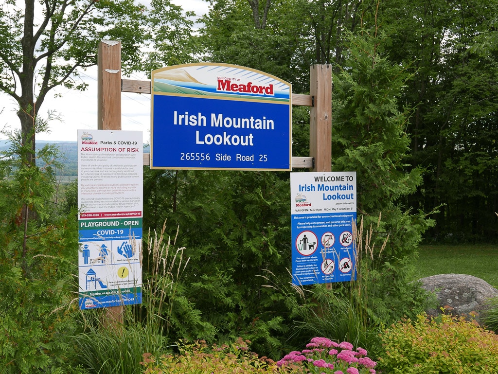Our friendly guide from the Tourist Information booth had suggested checking out the view from a location called Irish Mountain Lookout, so we set the GPS for this destination and proceeded. We found the lookout, parked the car and went to the cliff to look over – it was indeed a wonderful view of Meaford and the entire county. We took lots of pictures, of course. There were only a few other people here and it was extremely quiet and peaceful: