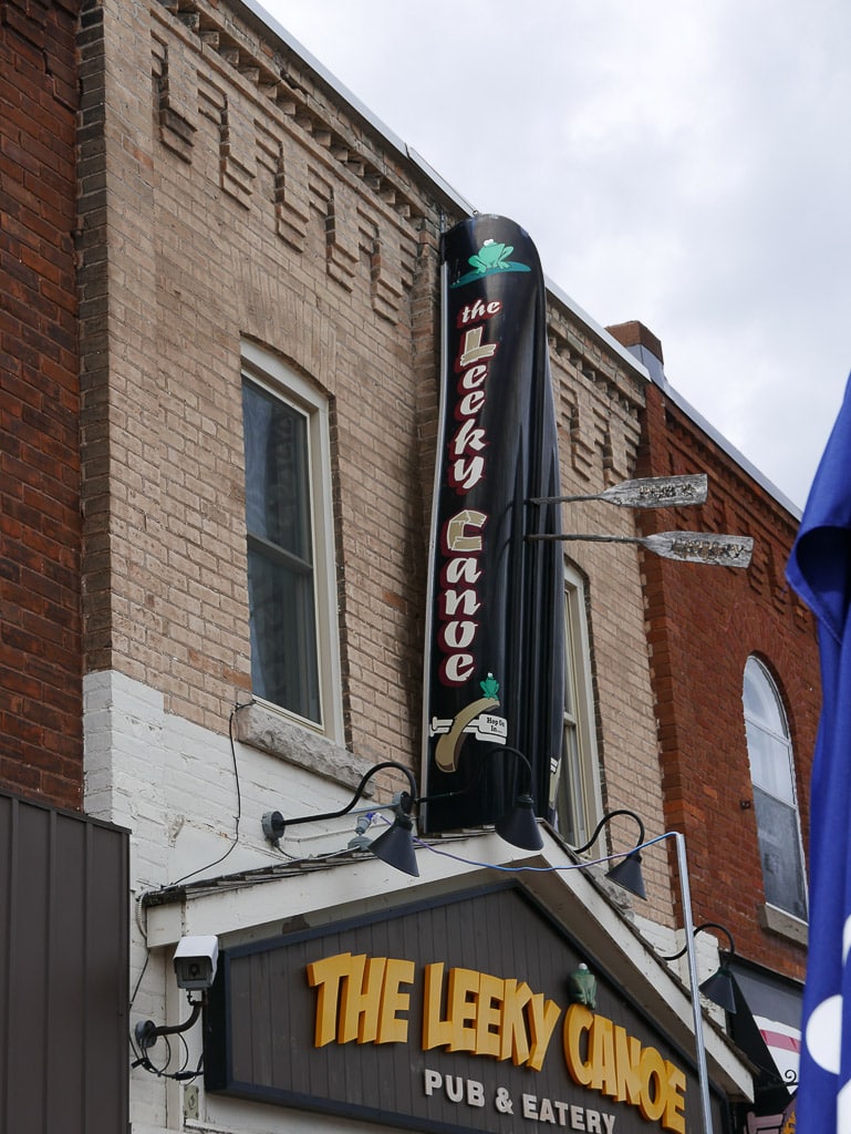 For lunch our guide recommended a couple of places, so we wandered off down main street in search of some mid-day sustenance. We decided to try one of the restaurants she’d highly recommended called The Leeky Canoe on Sykes Street. We sat out on the Leeky Canoe patio and, despite the hordes of wasps competing for our food, had a very good lunch. We both ordered the Mandori Grilled Chicken Wrap (recommended by our friendly rep at the Tourist Information place). It took a long, long time to come but was well worth it – fantastic!: